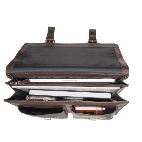 Laptoptas uit de Dakota serie van Leonhard Heyden. De Dakota serie is gemaakt van hoogwaardig gewaxt en geolied rundleder. Deze luxe laptoptas heeft 2 ruime compartimenten geschikt voor A4 materiaal en voorzien van gevoerd 13″ laptopvak. Van binnen afgewerkt met een prachtig luxe voering. Het hoofdcompartiment is voorzien van een verdeler, een ritsvak en een organisatiepaneel. Hierdoor zijn documenten en kleinere artikelen perfect op te bergen. Aan de achterzijde heeft de laptoptas enkele ritsvakken voor het opbergen van belangrijke documenten. Een stevig handvat aan de bovenzijde en een afneembare schouderriem met leren draagstuk zorgen voor maximaal draagcomfort.